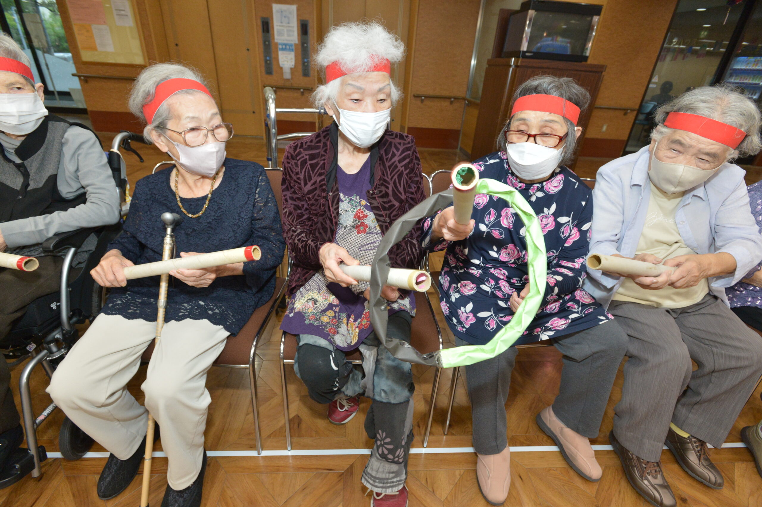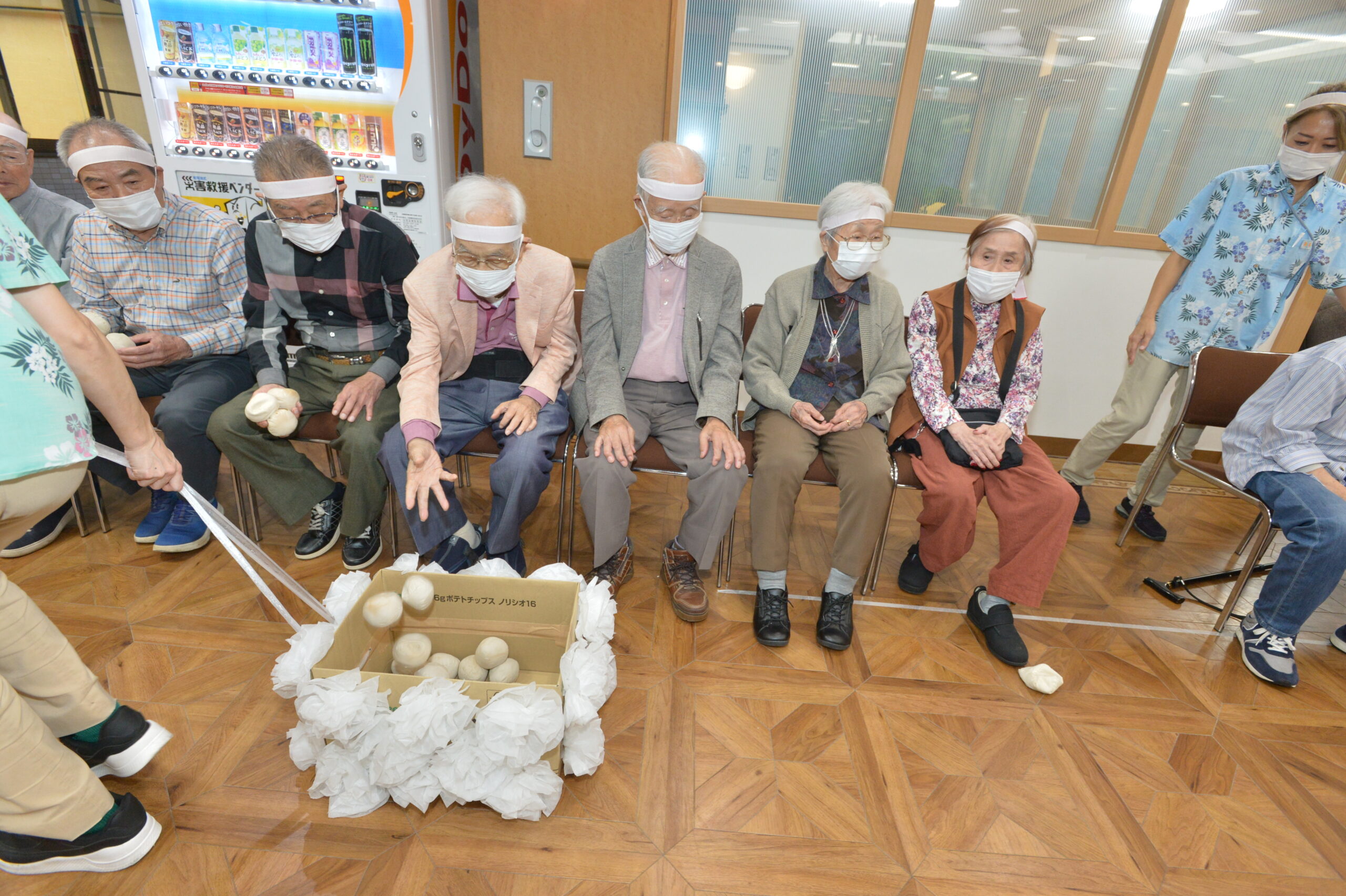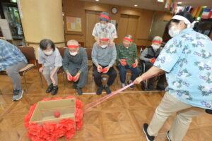 車椅子に乗ってもらい、杖で赤白の筒を転がします!(^^)!